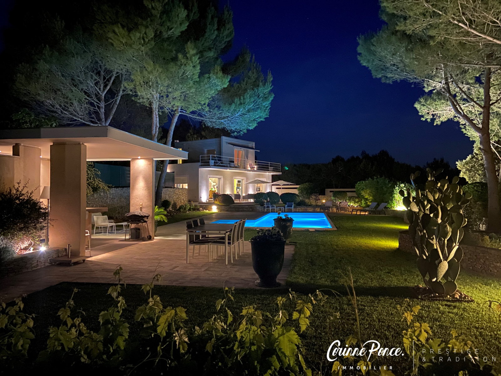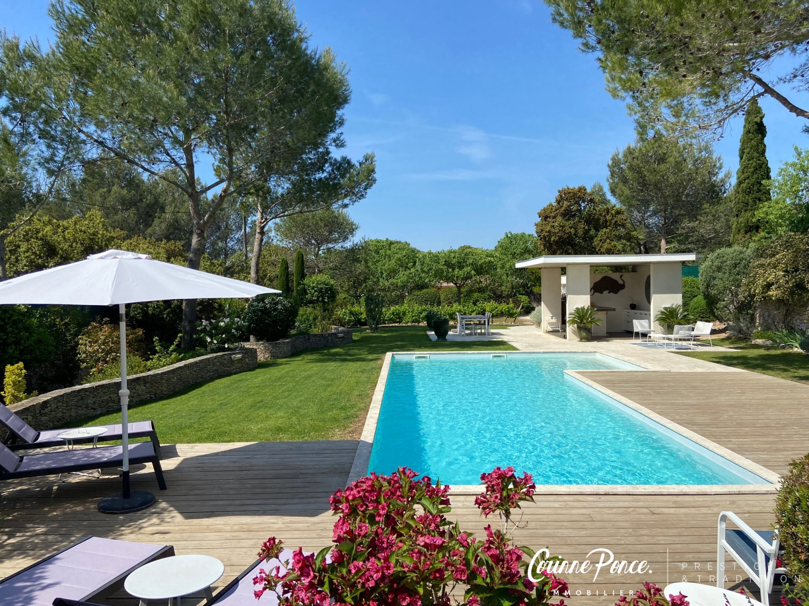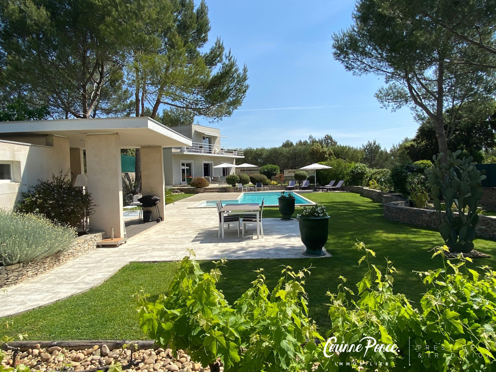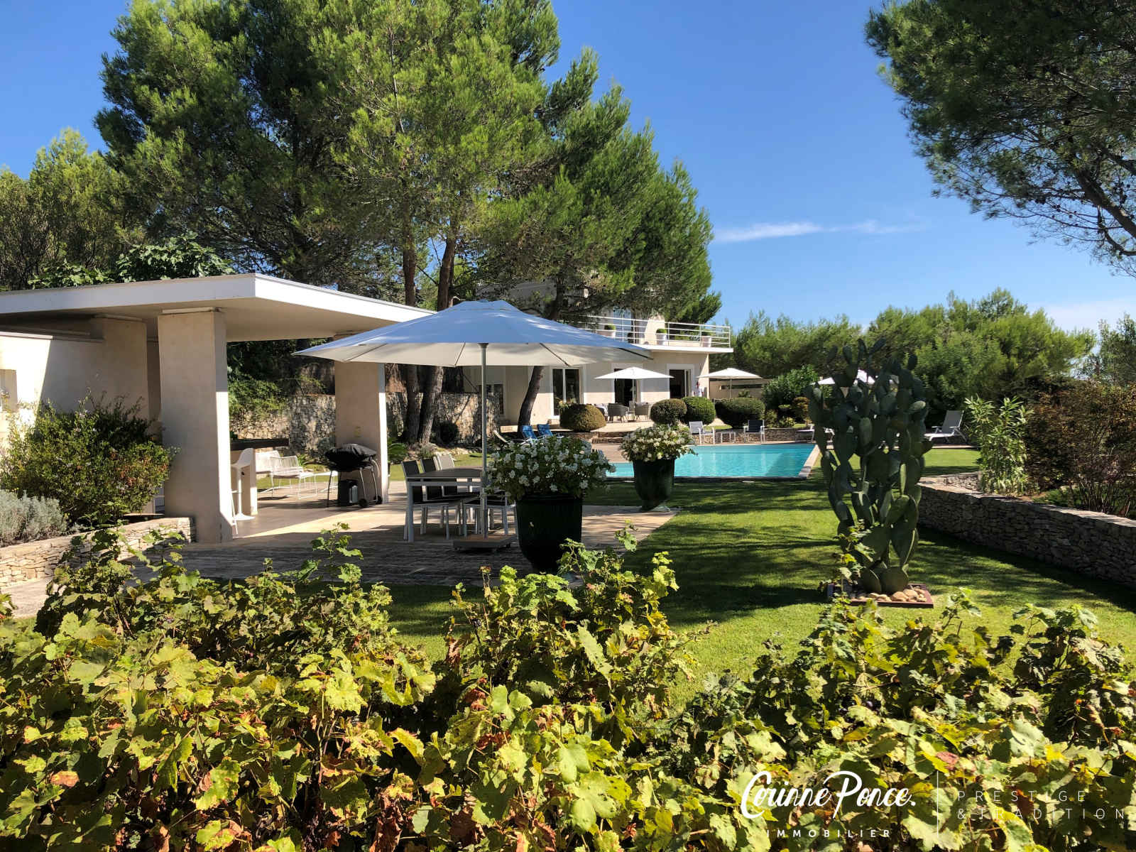 VENDU PAR NOS SOINS - Dans un cadre idyllique, sur les collines nord de Nîmes, l’agence Corinne Ponce immobilier vous propose cette superbe villa contemporaine d’une surface habitable d’environ 185 m² sur un magnifique terrain arboré de 3 000 m². Dès l'entrée, le charme opère, lumière, générosité des volumes et qualité des matériaux vous séduiront. La villa offre une très belle pièce de vie avec sa cuisine équipée, un séjour salle à manger avec une belle cheminée le tout s’ouvrant par des baies à galandages sur une vaste terrasse. La partie nuit s’articule autour d’un joli patio, trois belles chambres, une salle d'eau et une suite parentale avec salle de bain et douche. A l’étage une cinquième chambre avec sa salle d’eau et une agréable terrasse bénéficiant d'une vue dégagée sur la nature. Les extérieurs, particulièrement soignés, vous permettrons de profiter de ce cadre merveilleux. Vous serez sous le charme de son jardin, sa piscine chauffée, son pool house et ses terrasses pour des moments de détentes.Tout y est, climatisation gainable, double garage, arrière cuisine/buanderie, un bien d'exception dans un environnement très calme !